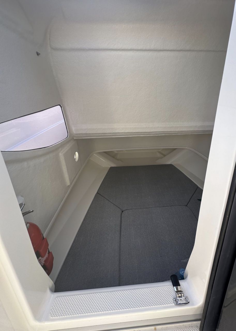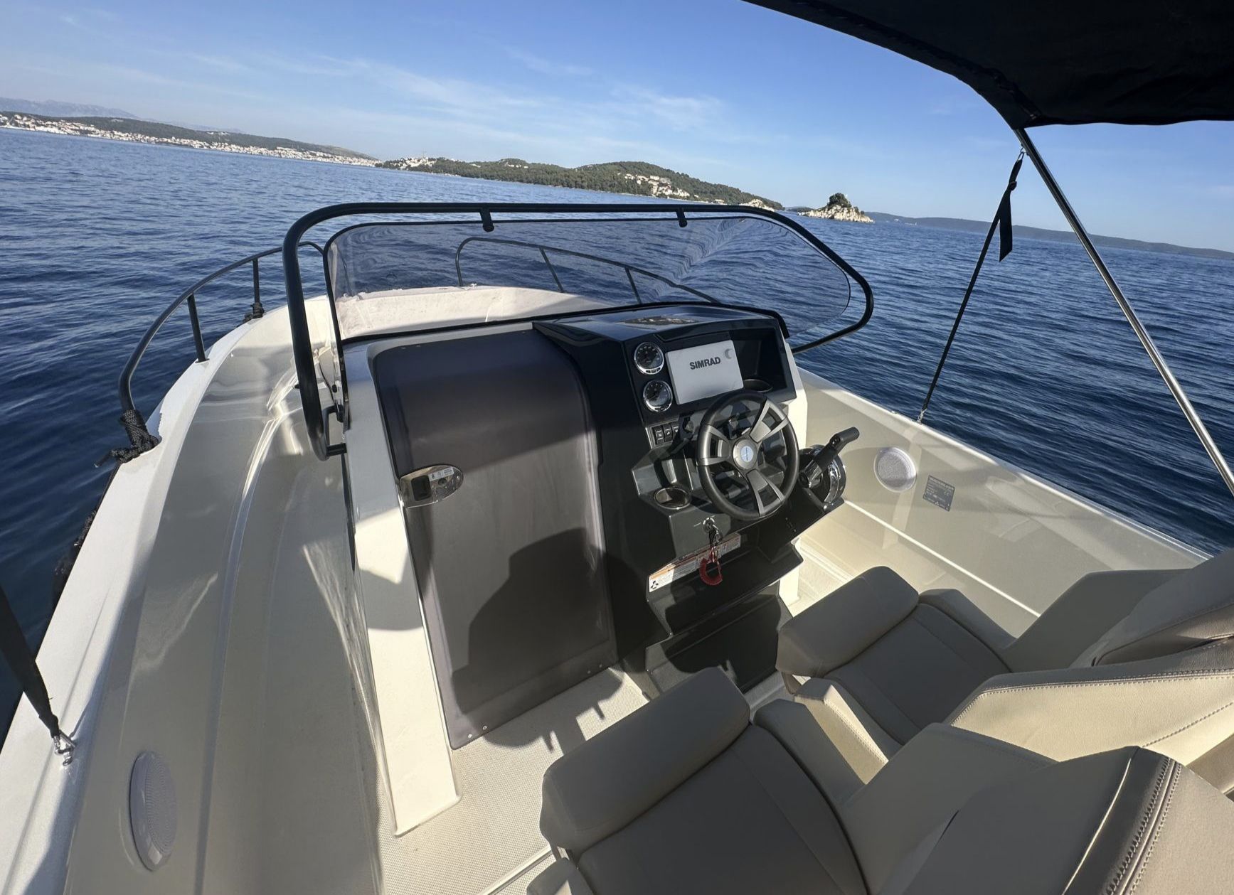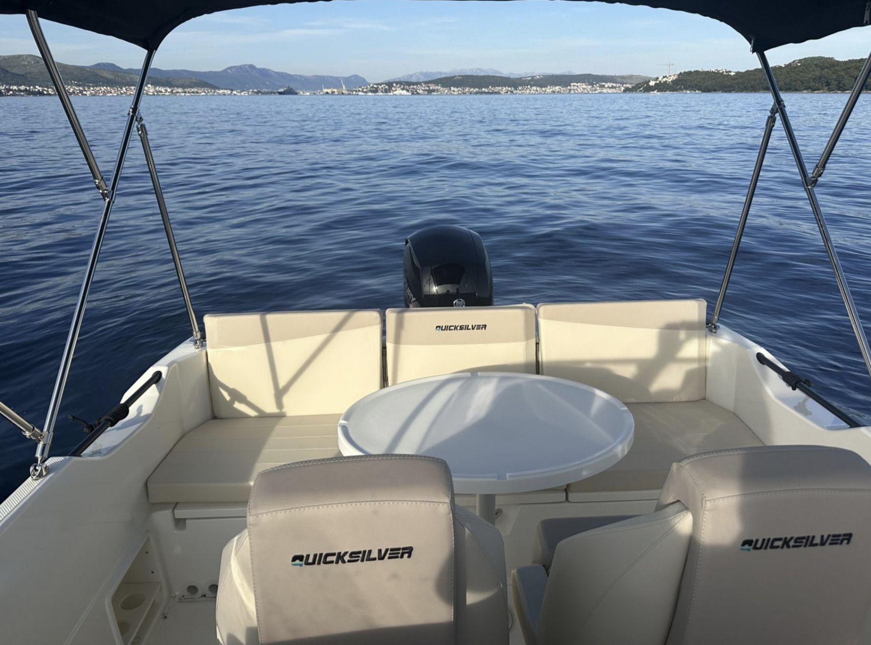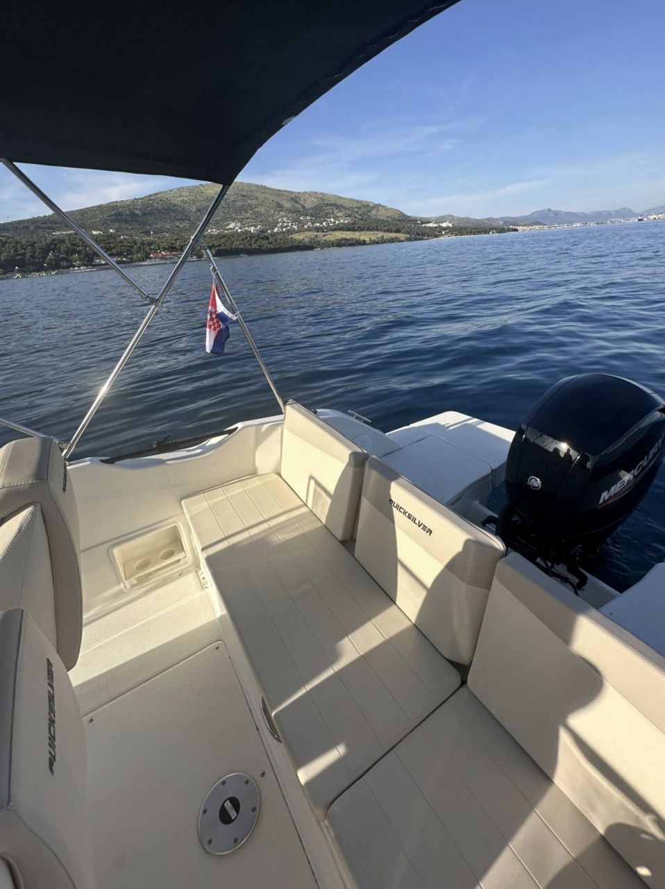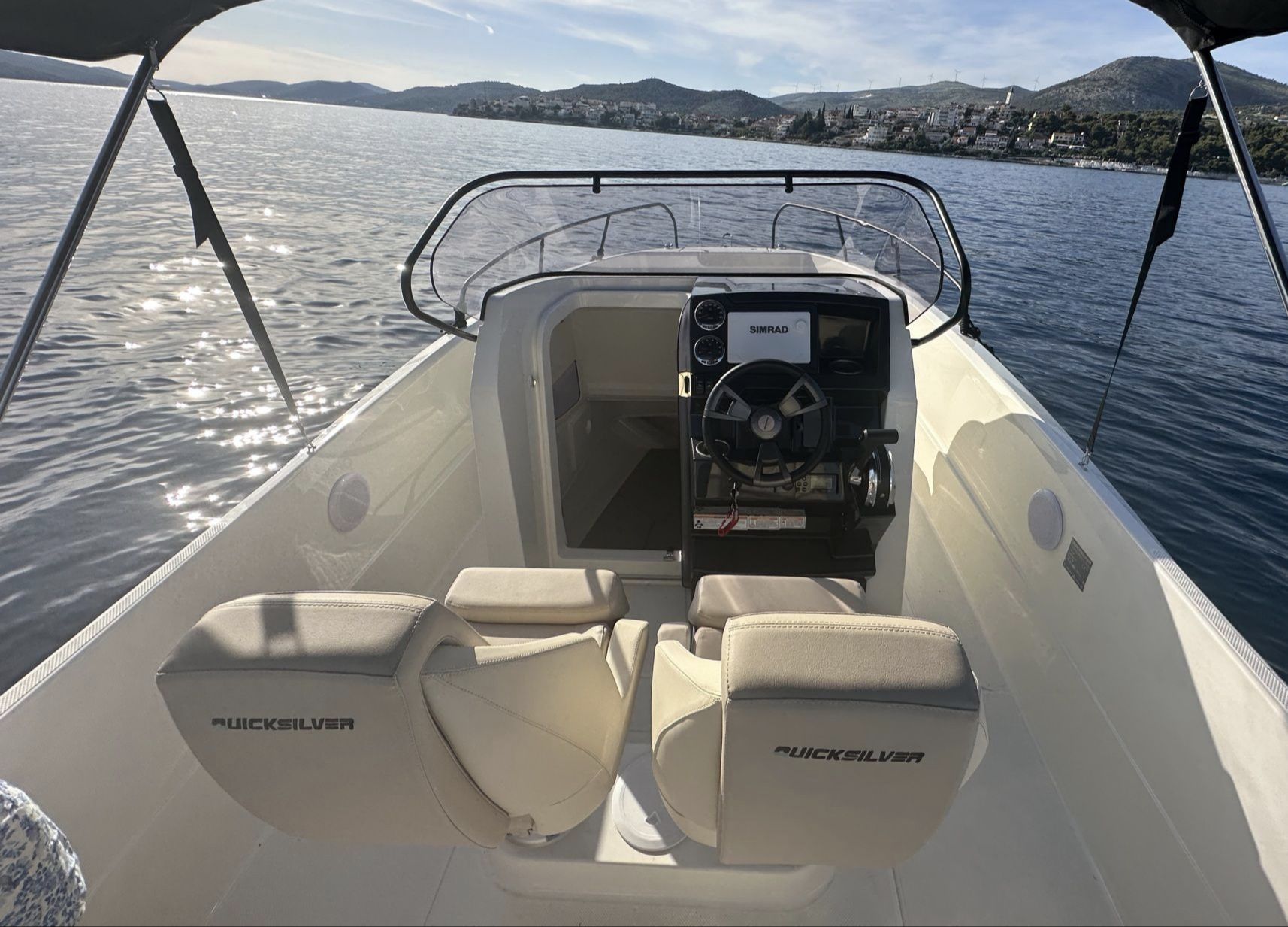 Discover the Adriatic Sea aboard the Quicksilver 705 Open – a versatile and stylish day cruiser perfect for family outings, swimming, and exploring the stunning Kornati archipelago.This well-equipped boat features a spacious cockpit with comfortable seating, a convertible bow area ideal for sunbathing, a protective bimini top, and a compact cabin below deck for storage or a quick rest. The modern helm station includes SIMRAD navigation electronics, ensuring safe and easy navigation through the islands. The extended swim platform provides convenient water access for swimming and snorkeling.
